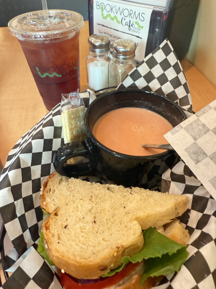 Well, between my morning book talk about The Third Act of Theo Gruene and my afternoon Phenology talk, I had lunch at Bookworms Cafe, an adorable cafe inside the library. As I enjoyed my soup/sandwich combo—a half cup of tomato basil and half a Hemingway sandwich—I remembered Bernice ate at the Bookworms Cafe too. And she ordered the soup/sandwich combo (only she ordered the Sylvia Plath sandwich instead of half a Hemingway.)