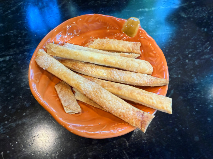 For a special treat, she baked strips of pie crust for us.