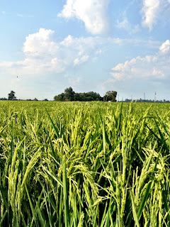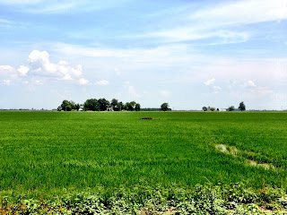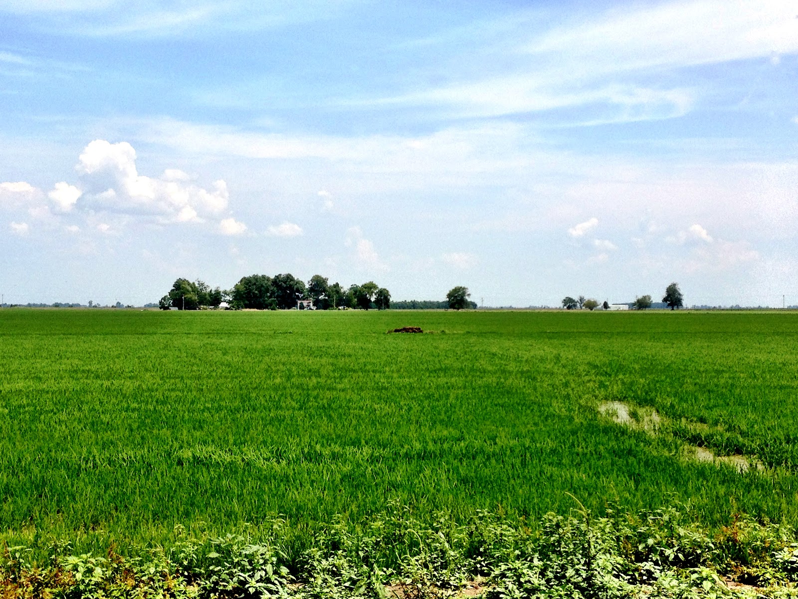 Now that the field behind our house has been leveled and irrigated, we have our own walking trail the size of the horse track at Oaklawn Park. Yesterday morning, with an unseasonably cool breeze, we set off for our morning hike around vivid green rice fields.
