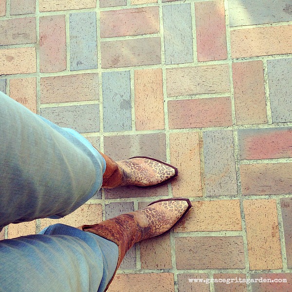 This is my favorite okra recipe, my “go-to” potluck, supper on the ground, picnic dish. I’m confident you will agree this is the perfect summer grilling menu side dish. Plus the recipe includes black-eyed peas. Think of all the extra luck you’ll have. Last week after I made this dish for a neighborhood get together, I won a pair of boots! No kidding, here’s a picture of my new boots.