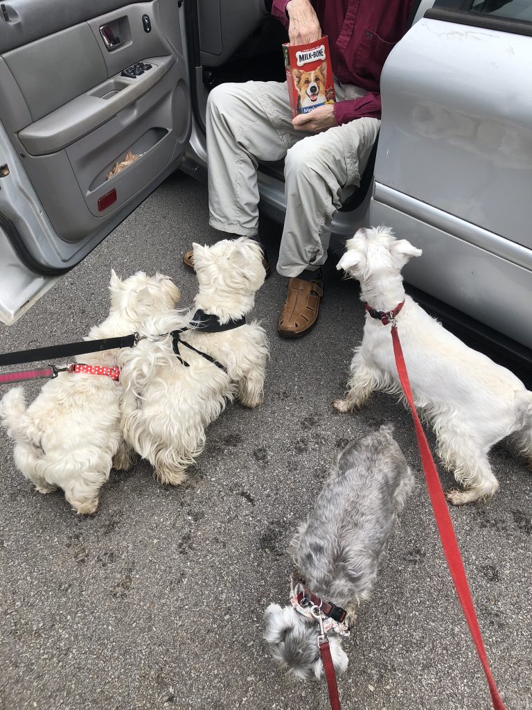 L to R: The Westies: Callie and Toby; The Schnauzers: Lucy and Annabelle